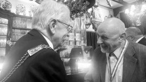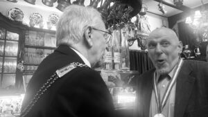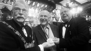 Walter Vennen bleibt unverdrossen auf der klaren Linie eines sprachgewandten, humorvollen und kenntnisreichen (da Goethe wenigstens kurz zitierenden) Bildungsbürgers. Das bringt Niveau in den Kreis der Ordensträger, die sich in ihren Gratulationen wirklich alle Mühe geben, dem neuen Freund und Bruder herzlich zu gratulieren. Sagen wir so: Alle haben sich tatsächlich bemüht. Nun, Scherz beiseite: Das ist immer ein ebenso spannender wie entspannender Schlagabtausch, ergänzt mit dem Anstimmen vieler Lieder mit schönen und durchaus auch sehr individuellen und noch nie gehörten Tönen.